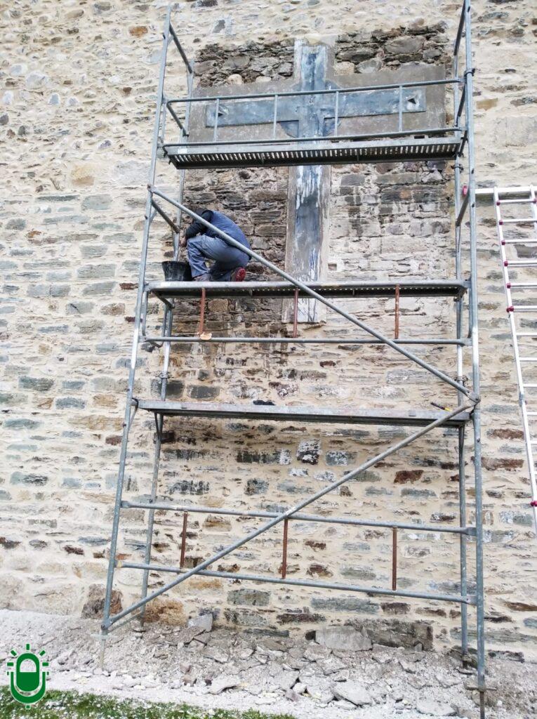 Sólo se mantendrá la cruz que completaba ese adorno y la intervención culminará rejuntando las piedras en esa fachada de la Colegiata.