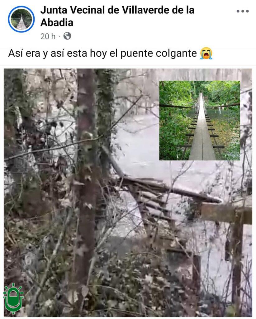La Junta Vecinal de Villaverde de la Abadía muestra, ya, plena disposición de recuperar su puente colgante en cuanto se pueda. Eso sí, su presidente, David Fernández, reconoce hoy tristeza y la ha expresado en un mensaje colgado en sus redes sociales.