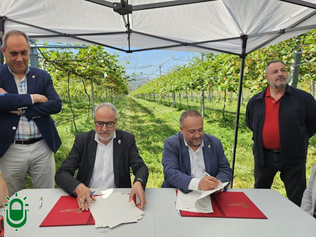 El nuevo convenio de colaboración se firmó, hoy, en Camponaraya, en una finca que gestiona el Banco de Tierras, en medio de otras dos parcelas cedidas hace varios años y en las que se puede comprobar su rendimiento. Una de ellas, se ha convertido en una plantación de kiwis de dos hectáreas y media. La otra tiene plantadas tres hectáreas de pimientos del Bierzo.