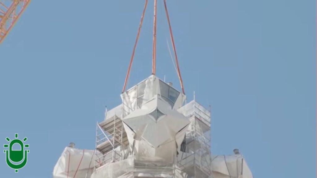 Cuando culminaba la maniobra, que fue ejecutada por una gigantesca grúa y transmitida en directo gracias a cámaras y drones, el director comercial de la vidriera del Bayo, Alberto Fernández Sutil, ha destacado la importancia de la aportación berciana que «por primera vez ha usado la tecnología prismática para convertir el vidrio en una pirámide», concretaba.